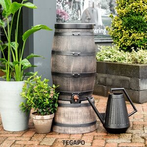 Bent u opzoek naar een houten regenton zonder onderhoud? Een echte houten regenton heeft veel onderhoud nodig, er moet altijd regenwater in de ton zijn of water tegen de wanden gesprayd worden om verdroging en lekkage te voorkomen. Een echte houten regenton moet 1x in de 2-3 jaar opnieuw in de lak gezet worden zodat de ton langer mee gaat. Met deze bijna niet van echt te onderscheiden regenton kunt u regenwater opvangen en gebruiken zonder intensief onderhoud. Deze regenton is voorzien van een zichtbare en voelbare houtnerfstructuur met een soort dubbele kleurstelling. Deze combinatie van structuur en kleur zorgen ervoor dat de regenton een natuurlijke uitstraling heeft. De kleuren zijn mat wat ervoor zorgt dat de ton niet 'plastic' oogt.
